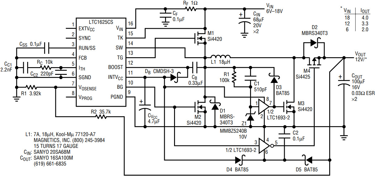 Nonoverlapping control signals for the switches M2 and M4 are generated from the LTC1625 and buffered by an LTC1693-2 dual MOSFET driver. Note that the control signal for the PFET M4 must be able to swing between ground and VOUT. Thus, the inverting half of the LTC1693-2 is powered from a diode-OR between INTVCC (for start-up) and VOUT.