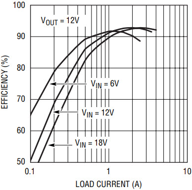 The LTC1625 uses MOSFET VDS sensing to control the inductor current peaks. Thus, the controller limits the average value of the inductor current rather than the output current in this topology. Because the input current varies as VIN is changed, the limit on output current depends upon the input voltage. With VIN = 12V, the maximum output current is about 3.3A. Efficiency of the circuit is shown in Figure 2.
