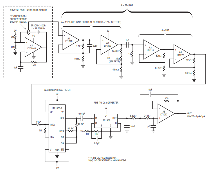 Figure 1’s high gain, low noise amplifier combines with a commercially available closed core current probe to permit the measurement. An RMS-to-DC converter supplies the RMS value. The quartz crystal test circuit shown in dashed lines exemplifies a typical measurement situation. The Tektronix CT-1 current probe monitors crystal current while introducing minimal parasitic loading. The probe’s 50Ω terminated output is fed to A1. A1 and A2 take a closed loop gain of 1120; excess gain over a nominal gain of 1000 corrects for the CT-1’s 12% low frequency gain error at 32.768kHz.1 A3 and A4 contribute a gain of 200, resulting in total amplifier gain of 224,000. This figure results in a 1V/µA scale factor at A4 referred to the gain corrected CT-1’s output. A4’s LTC1563-2 bandpass filtered output feeds an LTC1968-based RMS-to-DC converter (A5), which provides the circuit’s output. The signal processing path constitutes an extremely narrow band amplifier tuned to the crystal’s frequency. Figure 2 shows typical circuit waveforms. Crystal drive, taken at C1’s output (trace A), causes a 530nA RMS crystal current, which is represented at A4’s output (Trace B) and the RMS-to-DC converter input (Trace C). Peaking visible in Trace B’s unfiltered presentation derive from inherent and parasitic paths shunting crystal.