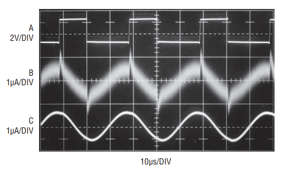 Figure 2. The 32.768kHz output of the crystal oscillator (Trace A) and crystal current monitored at A4 output (Trace B) and the RMS-to-DC converter input (Trace C). Peaks in Trace B’s unfiltered waveform derive from inherent and parasitic paths shunting the crystal.
