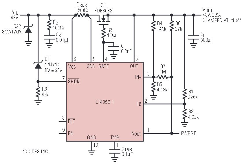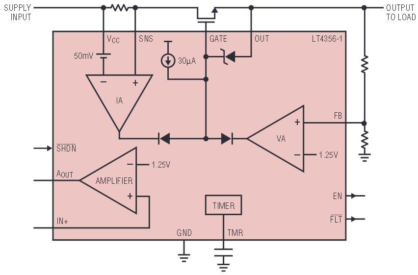 Figure 1 shows a functional block diagram of the LT4356. Under normal operating conditions, it drives the gate of an N-channel MOSFET pass device fully on so that its presence is of no consequence to the load circuitry. The MOSFET is called into duty as a series limiter in case of overvoltage or overcurrent conditions. If the input voltage rises above a regulation point set by the FB divider, the voltage amplifier VA drives the MOSFET as a linear regulator, limiting the output voltage to the prescribed value and allowing the load circuitry to continue operating, uninterrupted. To protect the MOSFET and load from short circuits, the LT4356 includes current limiting.