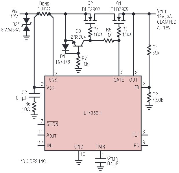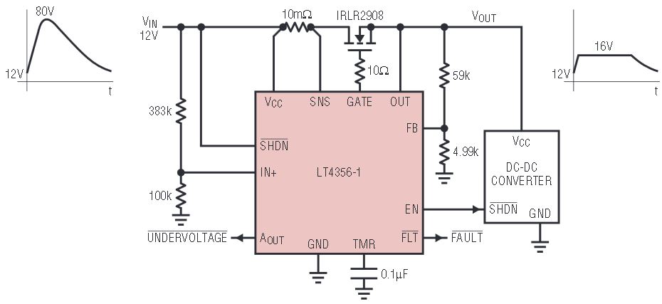 The LT4356 surge stopper eliminates the need for bulky filtering components by isolating low voltage circuitry from damaging spikes and surges found in automotive, avionic and industrial systems. The LT4356 also guards against overloads and short circuits, and withstands input voltage reversal.
