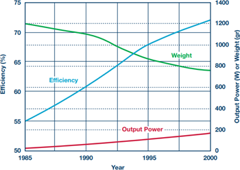 图1. TWT效率、输出功率和重量随着时间推移而改进