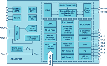 ADuCRF101是一款针对低功耗无线应用而设计的完全集成式数据采集解决方案,例如,采用输出数据带宽要求低于数十kHz的惯性测量单元(IMU)传感器,并结合来自ADI公司的集成RF收发器的精密模拟微控制器ARM® Cortex®-M3。其设计注重灵活性、稳定性、易用性和低功耗特性。这种结合纯属假设,但会是航空电子传感器技术与COTS RF器件搭配使用的一个例子。相信此类RF方案很快就会用来拯救SWaP。