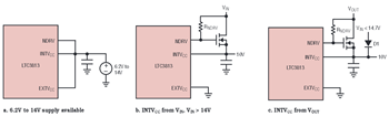 The LTC3813’s internal control circuitry and top and bottom MOSFET drivers operate from a supply voltage in the range of 6.2V to 14V(4.2V to 14V for the LTC3814-5). If the input supply voltage or another available supply falls within this voltage range it can be used to supply IC/driver power (see Figure 1a). If a supply in this range is not available, a single low current external MOSFET and resistor can be added to easily generate a regulated 10V (5.5V for the LTC3814-5) IC/driver supply using the internal linear regulator circuitry (Figure 1b). Using an external pass element has the advantage of reducing power dissipation on the IC and it also allows the transistor to be chosen with the appropriate BVDSS and power rating for the application—a small SOT23 package will often suffice.