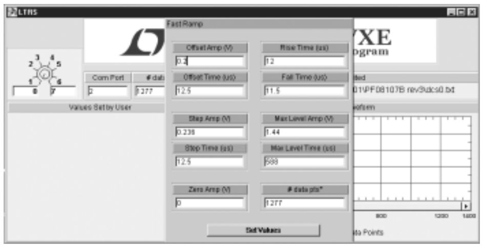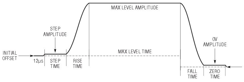 LTRSv2.VXE creates smooth ramp waveforms based on user inputs. The user controls all aspects of the ramp parameters such as initial DAC offset, step voltage and time, rise and fall times, and maximum voltage amplitude and time. LTRSv2.VXE uses a raised-cosine function to create smooth transitions between areas of varying amplitudes, such as between the step and the maximum amplitude (Figure 8).