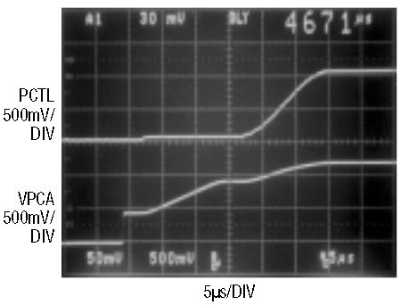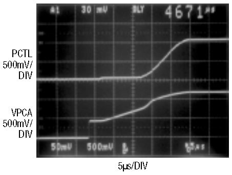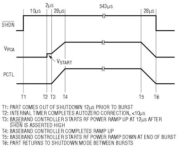 The ramp waveform begins with the DAC offset voltage. The offset improves ramp down characteristics of the power amplifier. A 100mV offset voltage is sufficient for the LTC4400-1 and fast power amplifiers, while a 200mV offset voltage is sufficient for the LTC4401-1 and slow power amplifiers. The offset time for the ramp is typically 12μs during which auto zeroing occurs. Figure 11 shows the timing relationship between SHDNB, VPCA and PCTL.