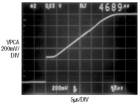 The initial step values are responsible for closing the voltage loop. VPCA must quickly rise to the RF power amplifier threshold voltage in order to meet power versus time specifications. If the initial step time or amplitude values are too low, the control voltage waveform will resemble VPCA in Figure 12. The resolution of the DAC allows for amplitude changes as small as 2mV. The step voltage can be changed in 1/2 microsecond multiples. There are some tradeoffs to take into consideration when choosing which parameters to change. For instance, if the step amplitude is too high, the RF output spectrum may exhibit spurs. However, if the step time is too long, as shown in Figure 13, meeting required power versus time is compromised because the time allotted for the burst portion is insufficient. Figure 14 shows the ideal shape for the control voltage. The rise portion of VPCA is smooth and has a constant slope until the maximum amplitude is reached.