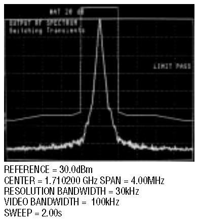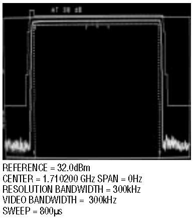 Figure 16 is the corresponding output RF spectrum for the control voltage shown in Figure 15. The center frequency is 1710.2MHz and the input power to the power amplifier is 0dBm. Figure 17 shows the power versus time measurement. The onscreen table, shown in Figure 6, represents the values entered to create the ramp waveform. The input step and ramp amplitudes include a 200mV offset amplitude. Therefore, the actual step voltage is 36mV and the ramp amplitude voltage is 1.24V.