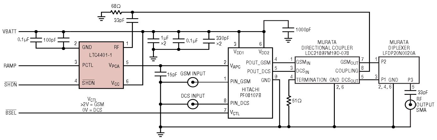 The DC401A board contains the LTC4401-1 power controller and Hitachi PF08107B dual-band power amplifier as well as a Murata dual band directional coupler and Murata diplexer (Figure 18). The directional coupler has a coupling loss of 14±1.5dB for the DCS frequencies and 19±1dB for the GSM frequencies. While the directional coupler is a viable solution, there is a cheaper and smaller solution that is comparable in performance (Figure 19).
