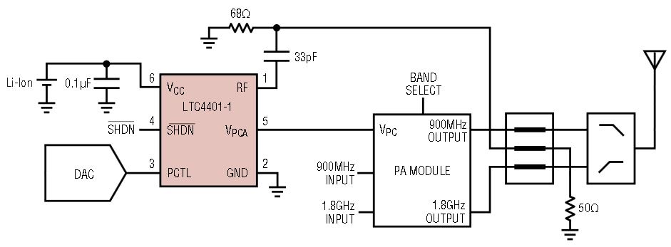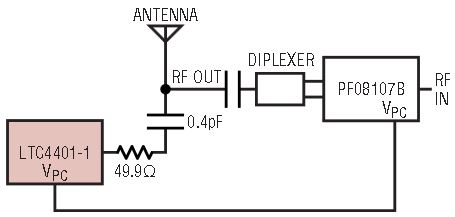 This new scheme completely eliminates the directional coupler, 50Ω termination resistor, and 68Ω shunt resistor. Instead, the RF signal is fed directly to the diplexer from the power amplifier. The RF signal is coupled back to the LTC4401-1 via a capacitor and a series resistor. The component count is reduced by two.