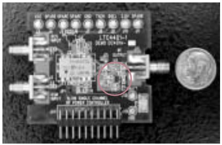 Figure 1a. The DC401A RF demo board. The circled area encloses the LTC4401 power controller (U4) and its required external components (C11, C12, C13 and R2).