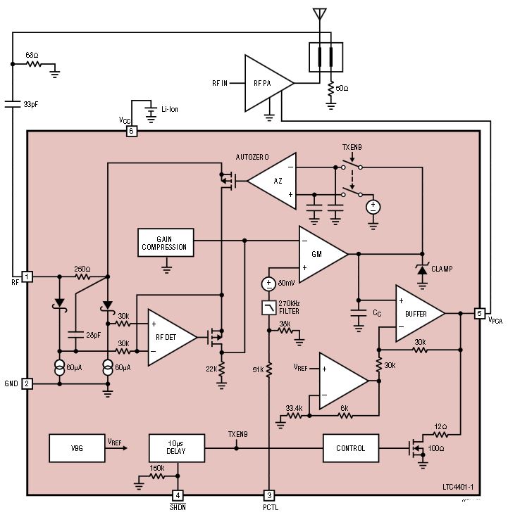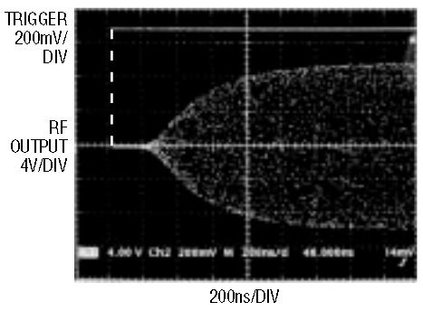 The external power control ramp is applied 12μs after SHDNB is asserted high by the baseband microprocessor. When the ramp is applied, the VPCA voltage begins to rise. The RF power amplifier turns on when VPCA reaches the RF power amplifier’s threshold voltage. VPCA actually starts from 450mV. This start voltage reduces the time required to turn on the RF power amplifier and is lower than power amplifier threshold voltages used in mobile radio applications. The power control loop is open until the RF power amplifier turns on and starts supplying an RF output signal. While the loop is open, the VPCA rise time is limited by the LTC4400/4401 bandwidth and the magnitude of the PCTL signal. A portion of the RF output voltage is fed back to the LTC4400/4401 RF pin. This signal is then peak detected by an internal Schottky diode and capacitor. The detected voltage is applied to the negative input of the loop amplifier thereby closing the power control loop. Once the loop has closed, the RF output signal follows the power ramp signal at PCTL.