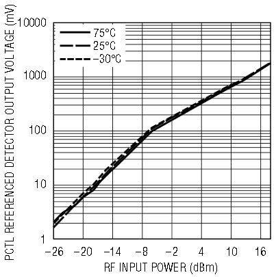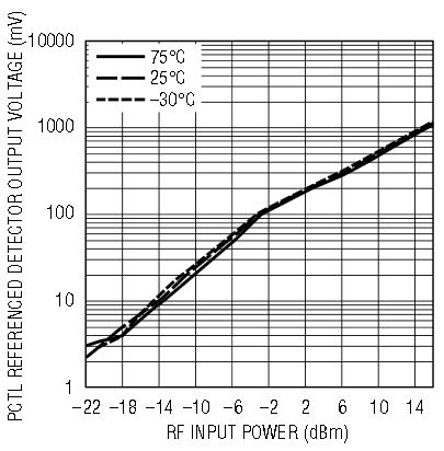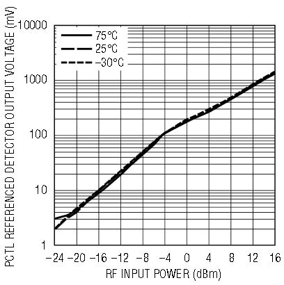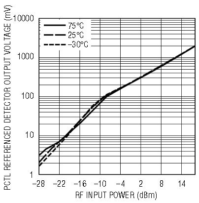 The LTC4400 and LTC4401 incorporate two features to improve detector dynamic range. An auto zero system eliminates both internal offsets and external power control DAC offsets. Secondly, a compression circuit allows for higher feedback signals at lower RF power levels to extend the power detector range. The fully integrated detector has a small temperature coefficient as shown in Figure 3.