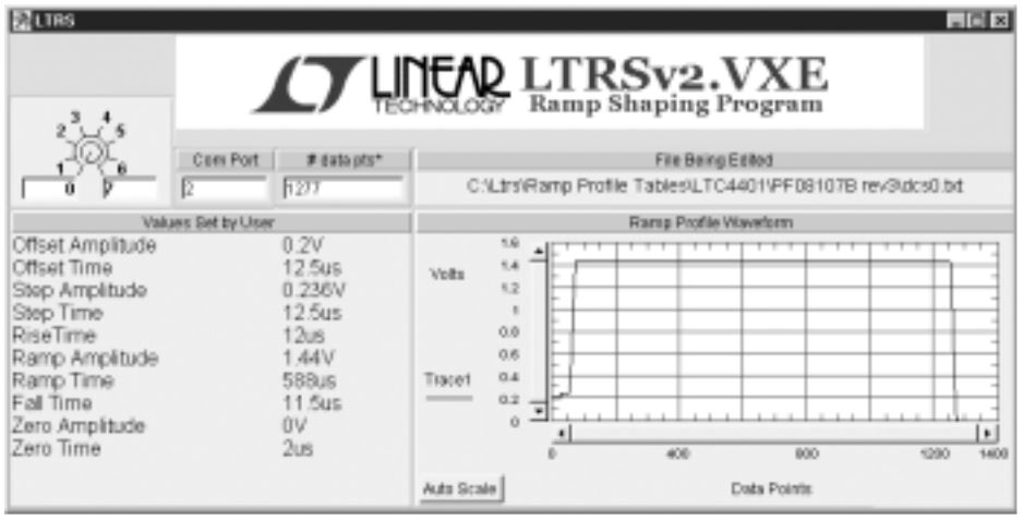 LTRSv2.VXE ramp profile parameters are saved in tables as text files. Linear Technology distributes LTRSv2.VXE with HP VEE Runtime, HP I/O Libraries, and ramp profile table templates for various power amplifiers. Each ramp profile waveform table can be edited or overwritten using LTRSv2.VXE. These ramp profile table templates serve as an excellent starting place for ramp-shaping. Figure 9 is an illustration of a typical ramp profile waveform with the ramp parameters labeled. Figure 10 shows the program window where the user changes ramp profile waveform parameters.