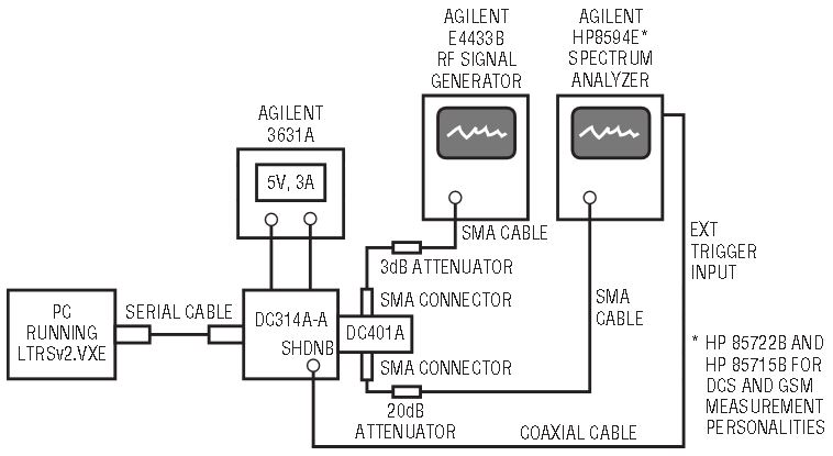 Version 2 of the LT ramp-shaping program (LTRSv2.VXE) is available from Linear Technology. Figure 6 shows the program window of LTRSv2.VXE in ramp-shaping mode. This program lets users generate, reshape, and load ramp profile waveforms onto the DC314A digital demo board. The DC314A digital demo board provides regulated power supplies, control logic and a 10-bit DAC to generate the SHDNB signal and the power control PCTL signal. Flash memory and a serial port interface are also included for updating DAC profiles stored on the DC314A. Eight power control profiles can be stored in the flash memory. A rotary switch (SW1) can be used to select the desired power profile. The DC314A provides signals to the DC401A RF demo board, which contains a GSM/DCS RF channel, LTC4401-1 Thin-SOT power controller, and Hitachi PF08107B power amplifier (Figure 1B). The RF test measurement setup is shown in Figure 7.