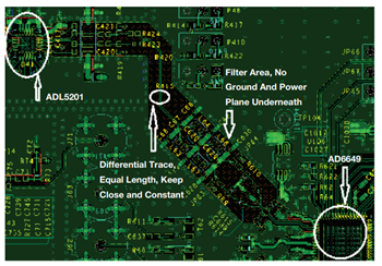 ADI公司接收器参考设计板(参见图26)提供了差分滤波器PCB布局的一个示例。这显示了ADL5201和AD6649之间有一个五阶滤波器。AD6649是一款14位250 MHz流水线式ADC,具有非常好的SNR性能。