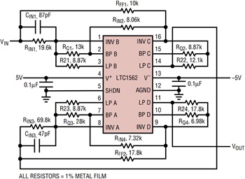 The active (that is, amplifier) circuitry in the LTC1562 was designed expressly for filtering. Because of this, filter noise is due primarily to the circuit resistors rather than to the amplifiers. The amplifiers also exhibit exceptional linearity, even at high frequencies (patents pending). The noise and distortion performance for filters built with the LTC1562 compares favorably with filters using expensive, high performance, off-the-shelf op amps that demand many more external parts and far more board area (we know, because we’ve built them). The details of this performance depend on Q and other parameters and are reported for specific application examples below. As with other low distortion circuits, accurately measuring distortion performance requires both an input signal and distortion-analyzing equipment with adequately low distortion floors.