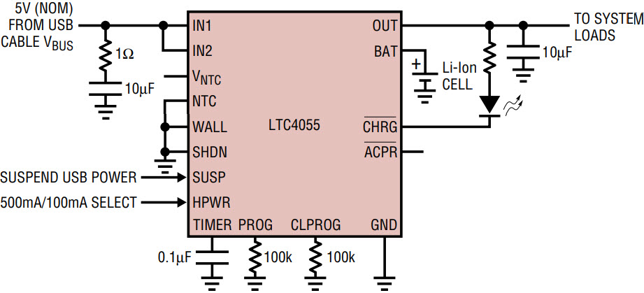 USB hosts, or powered hubs, provide as much as 500mA from their nominal 5V supply. The greater efficiency of running the load at the USB supply voltage (instead of the battery voltage) means there is more current left in the 500mA USB budget for charging the battery. Because the battery is not in the power path while the application is tied to the USB or wall adapter, the application can be powered even if the battery is low or dead. The same reasoning applies for fully charged batteries. A fully charged battery, which is not in the power path until the USB or external power is removed, stays fully charged. Figure 1 shows just how simple the PowerPath control and battery charging in a USB application can be implemented using the LTC4055.