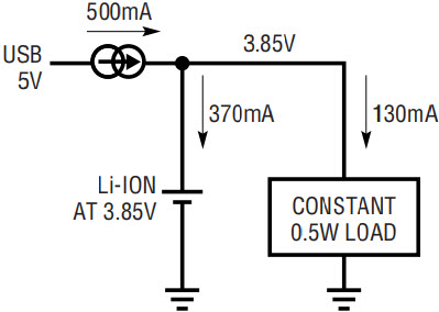 Figure 2 compares a topology that includes the battery in the power path to one that switches the battery out of the power path when it is not needed. Figure 2a shows a constant 0.5W load tied directly to the Li-Ion battery. The USB current is limited to 500mA and the nominal battery voltage is 3.85V. Thus, the current required to power the load is 0.5W/3.85V = 130mA. That leaves 370mA (500mA – 130mA) to charge the battery. Figure 2b shows a 0.5W constant power load tied directly to the USB through a sense resistor. The voltage at the load is 4.98V and the current required by the load is 100mA (0.5W/5V). The current left for battery charging is 400mA (500mA – 100mA), an 8% improvement over the 370mA available when the battery is in the power path.