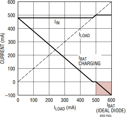 Figure 3. Input and battery currents as a function of load current in high power mode with the current limit set to 500mA (RCLPROG = 100kΩ) and the charge current set to ≥ 500mA (RPROG ≤ 100kΩ). Note that as load current exceeds the USB current limit, the charge current to the battery becomes negative.
