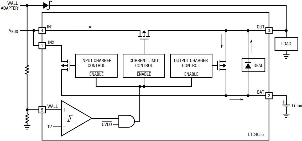 Rechargeable batteries are commonly used to power portable Universal Serial Bus (USB) devices, such as PDAs or MP3 players. The USB itself can be used to directly power the device or charge a battery. The LTC4055 uses PowerPath™ control to seamlessly and efficiently steer the load to the preferred source of power; all while remaining within the specified USB current limit; and charge the battery with any available leftover current. When the USB is present, the LTC4055 connects the USB power directly to the load. When both the USB and a wall adapter are present, the LTC4055 can be configured to have the wall adapter supercede the USB as the source of power. These direct connections to the load translate to higher load voltages and greater efficiency.