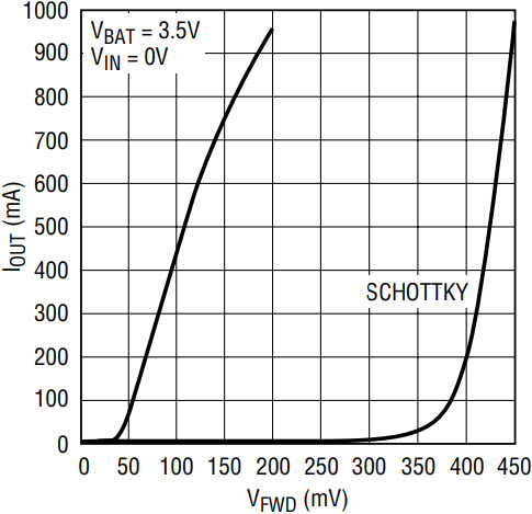 An internal ideal diode function prevents reverse conduction from the load to the battery when the load voltage is greater than the battery voltage. This same ideal diode function provides a low forward drop (55mV typ. at100mA) from the battery to the load if the load current should exceed the USB limit or if the battery is the only source of power. The forward characteristics of the ideal diode compared to those of a Schottky diode are shown in Figure 5.
