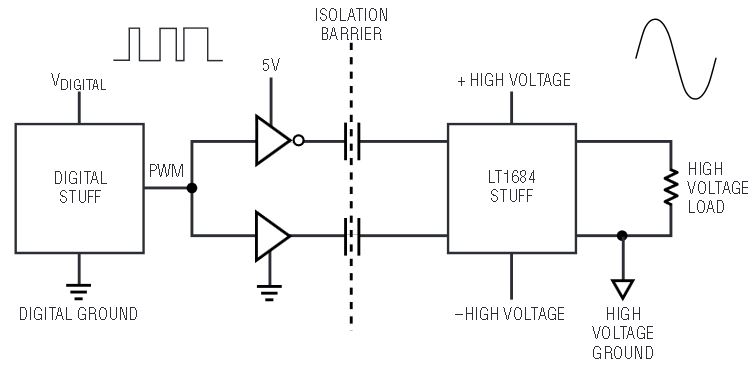 Figure 1. The LT1684 uses differential pulse width modulation to provide isolation for digitally controlled analog power solutions.