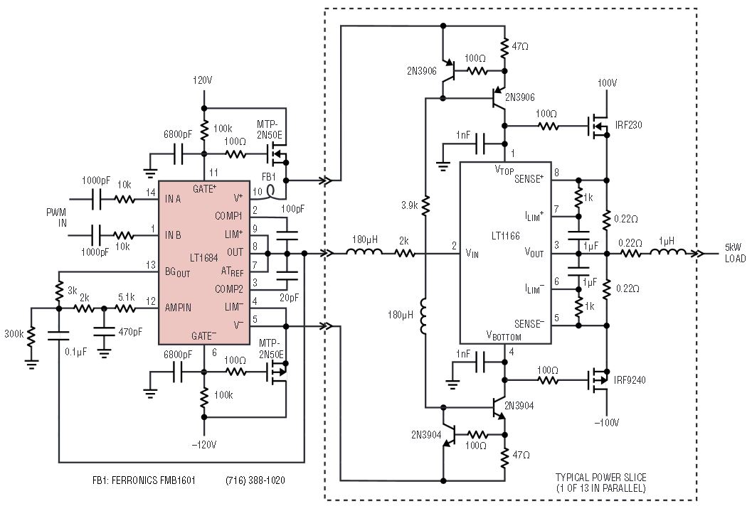 The LT1684, used as shown in Figure 1, outputs a ring signal that meets Belcore specification. This means we can ring a phone 22,000 feet away. The LT1684 fits another role, where 22,000 feet of separation would be a nice minimum. This is the application of the LT1684 in the scaleable power amplifier, as detailed in Figure 4. This amplifier can be used to drive motors, simulate the power company in sine wave UPS systems and operate large audio drivers. Because of its scaleable nature, this design can be used at any power level. The circuit in Figure 4 is shown implementing a 5000W bits-to-decibels converter. When this converter is implemented with the appropriate audio drivers and enclosures, the output sound pressure level can be significant—so significant, in fact, that the author suggests giving it a wide berth of at least 22,000 feet.