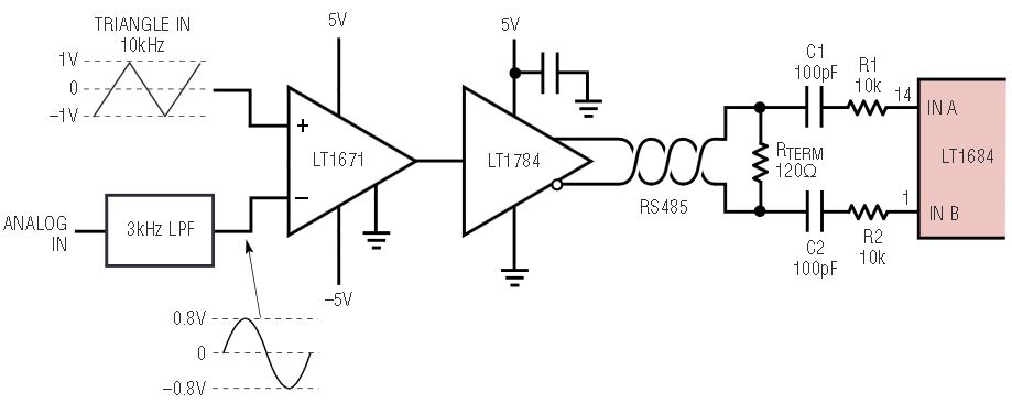 The scaleable amplification system detailed in Figure 4 can be driven with analog inputs while still maintaining full isolation. Such a system is detailed in Figure 5, where the analog input is filtered (to prevent ailiasing) and converted to PWM. Figure 5 goes on to show the use of an RS485 differential driver to drive a twisted pair line. The receiver end of the twisted pair line is terminated with a resistor and put across the isolation barrier. This provides very good ESD protection on both ends of the line.