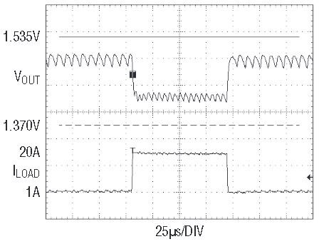 Figure 1 shows the schematic diagram of a 20A VRM8.5 design for an Intel processor operating at 1.2GHz. Efficiency is greater than 80% over a wide load range, as shown in Figure 2. With two 680µF Sanyo POSCAPs, the output voltage deviation remains within the VRM8.5 specification when load current switches between CPU leakage and full load, as shown in Figure 3. The entire VRM design fits into a 1.25"×1.5", double-sided PCB area with an overall height below 0.35".