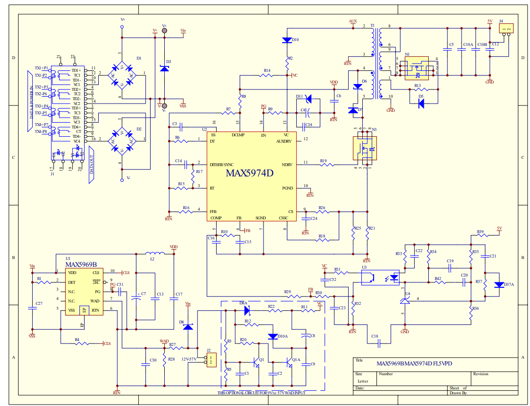This reference design features the MAX5969Band MAX5974D. The MAX5969B controller is fully compliant with the IEEE 802.3af/at standard in a power-over-Ethernet (PoE) system. The device can also be powered from a wall adapter (WAD). The MAX5974D controls wide 9V to 57V input-voltage, active-clamped, current-mode PWM converters and provides frequency foldback. Using these devices, this reference design is IEEE 802.3af/at compliant. It is also a high-performance, compact, and costeffective solution for a Class 2 PD or a Class 3 PD.