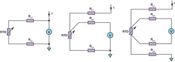 为了产生测量电压,RTD需要激励电流。根据RTD类型,电压电平从几十到几百mV不等。测量系统的精度不仅取决于温度传感器,还取决于选择合适的测量仪器、系统配置以及测量电路类型。根据导线数量,RTD传感器可用于2线、3线或4线测量电路。这些不同测量电路的对比如图1所示。