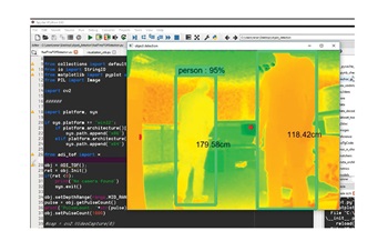 ADI provides simple sample code in Python to support customer evaluations. The example below shows a screen shot of real-time Python source code being used to detect and classify a person, and then apply a depth measurement to determine where the person is relative to the sensor. Other algorithms that are available include edge detection, object tracking, and a 3D safety curtain.