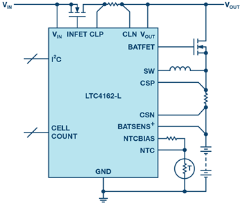 Finally, the LTC4162 is housed in a 28-lead, 4 mm × 5 mm QFN package with an exposed metal pad for excellent thermal performance. E- and I-grade devices are guaranteed for operation from –40°C to +125°C.