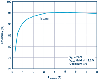 The LTC4162 (see Figure 1) contains an accurate 16-bit analog-to-digital converter (ADC) that continuously monitors numerous system parameters on command, including input voltage, input current, battery voltage, battery current, output voltage, battery temperature, die temperature, and battery series resistance (BSR). All system parameters can be monitored via a two-wire I2C interface, while programmable and maskable alerts ensure that only the information of interest causes an interrupt. The device’s active maximum power point tracking algorithm globally sweeps an input undervoltage control loop and selects an operating point to maximize power extraction from solar panels and other resistive sources. Further, its built-in PowerPath topology decouples the output voltage from the battery, thereby allowing a portable product to start up instantly when a charging source is applied under very low battery voltage conditions. The LTC4162’s onboard charging profiles are optimized for a variety of battery chemistries including Li-Ion/polymer, LiFePO4, and LA. Both charge voltage and charge current can be automatically adjusted based on battery temperature to comply with JEITA guidelines or be customized. For LA, a continuous temperature curve automatically adjusts the battery voltage based on the ambient temperature. For all chemistries, an optional die junction temperature regulation system can be engaged, preventing excess heating in space constrained or thermally challenged applications. See Figure 2 for Li-Ion charging efficiency performance.