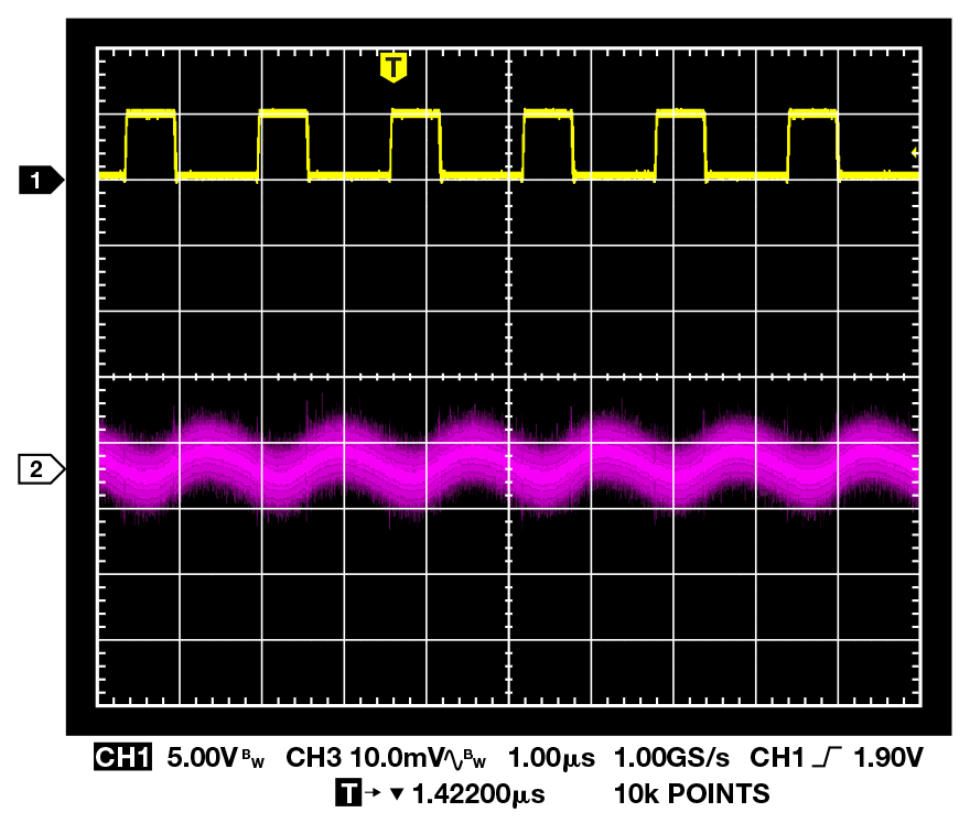 As shown in Figure 7, probing directly on the output capacitor using a grounded coil wire produces nearly optimal detail in the output ripple. Noise at the switching transition is improved, and trace inductance on the PCB is significantly reduced. However, a low-amplitude signal silhouette is still superimposed on the ripple, as shown in Figure 8.