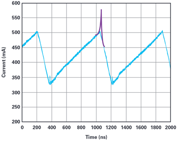 Figure 3 shows the measurement of the inductor current (in blue) for a switched-mode power supply sensed with a current probe compatible with the oscilloscope used. In addition to the measurement shown in blue, a purple marking was added, indicating how the current flow through the inductor would look when the inductor starts to saturate excessively toward the peak currents. This happens when an inductor is selected that does not have enough current rating for a given application. One of the main reasons for measuring inductor current in a switched-mode power supply is so that one can recognize whether the inductor was properly selected or whether inductor saturation will occur in operation or during a fault condition.