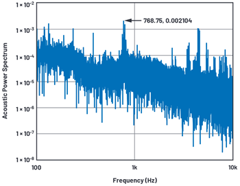To confirm, I measured the lab environment sound with a laptop microphone, processed the data with MATLAB®, and found that the noise correlates well with the measurement. A significant noise spike was seen at 768 Hz and other frequencies as seen in Figure 14. The culprit was the large ac duct running a few meters away from my bench. To make sure I was not picking up the noise of the laptop itself, I went into one of the phone booths, the acoustically quietest place, and took data. There was no 768 Hz measurement. Noise spikes at other frequencies were at least 100 times lower.