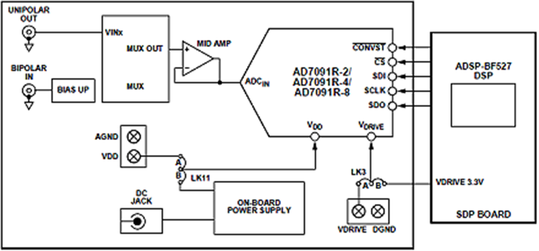 The EVAL-AD7091R-2SDZ, EVAL-AD7091R-4SDZ, and EVAL-AD7091R-8SDZ are full featured evaluation boards designed to allow the user to easily evaluate all features of the AD7091R-2/ AD7091R-4/ AD7091R-8 family of analog-to-digital converters (ADCs). The evaluation board can be controlled via the SDP connector (J13). The SDP board ( EVAL-SDP-CB1Z) allows the evaluation board to be controlled through the USB port of a PC using the evaluation board software available for download from the product page.