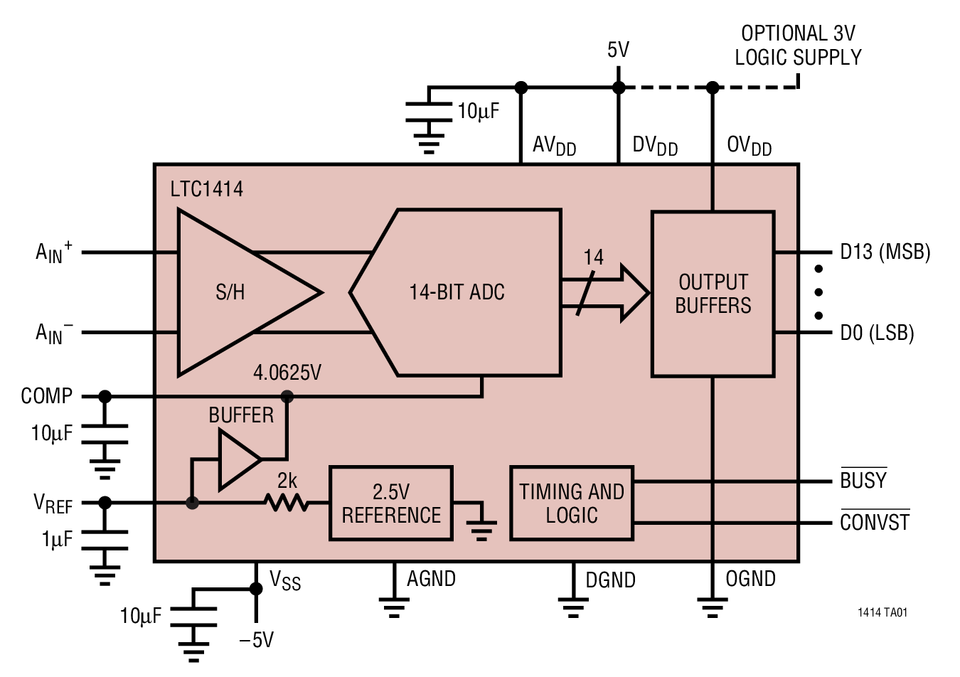 The LTC1414 is a 14-bit, 2.2Msps, sampling A/D converter which draws only 175mW from ±5V supplies. This high performance ADC includes a high dynamic range sample-and-hold, a precision reference and requires no external components.