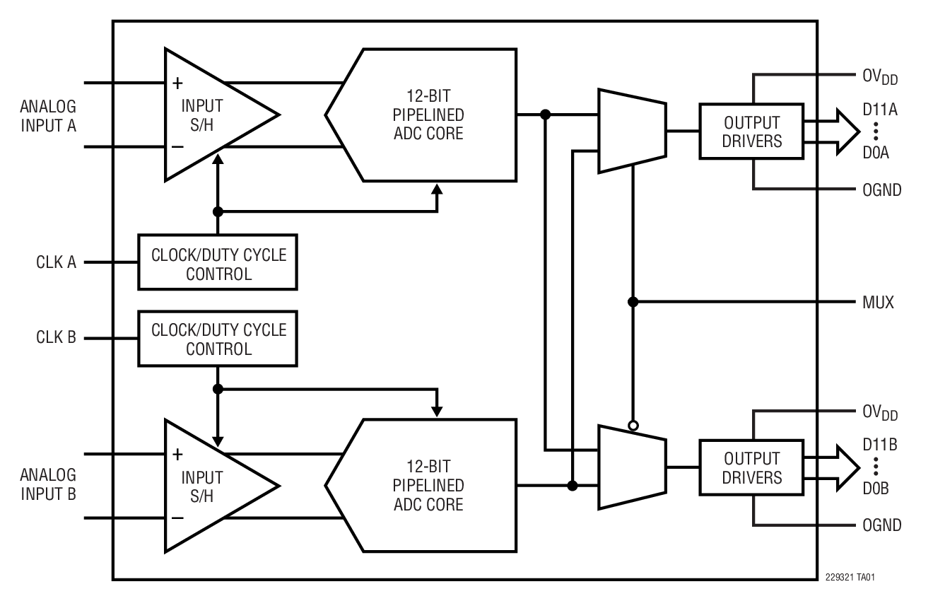 A single-ended CLK input controls converter operation. An optional clock duty cycle stabilizer allows high performance at full speed for a wide range of clock duty cycles.