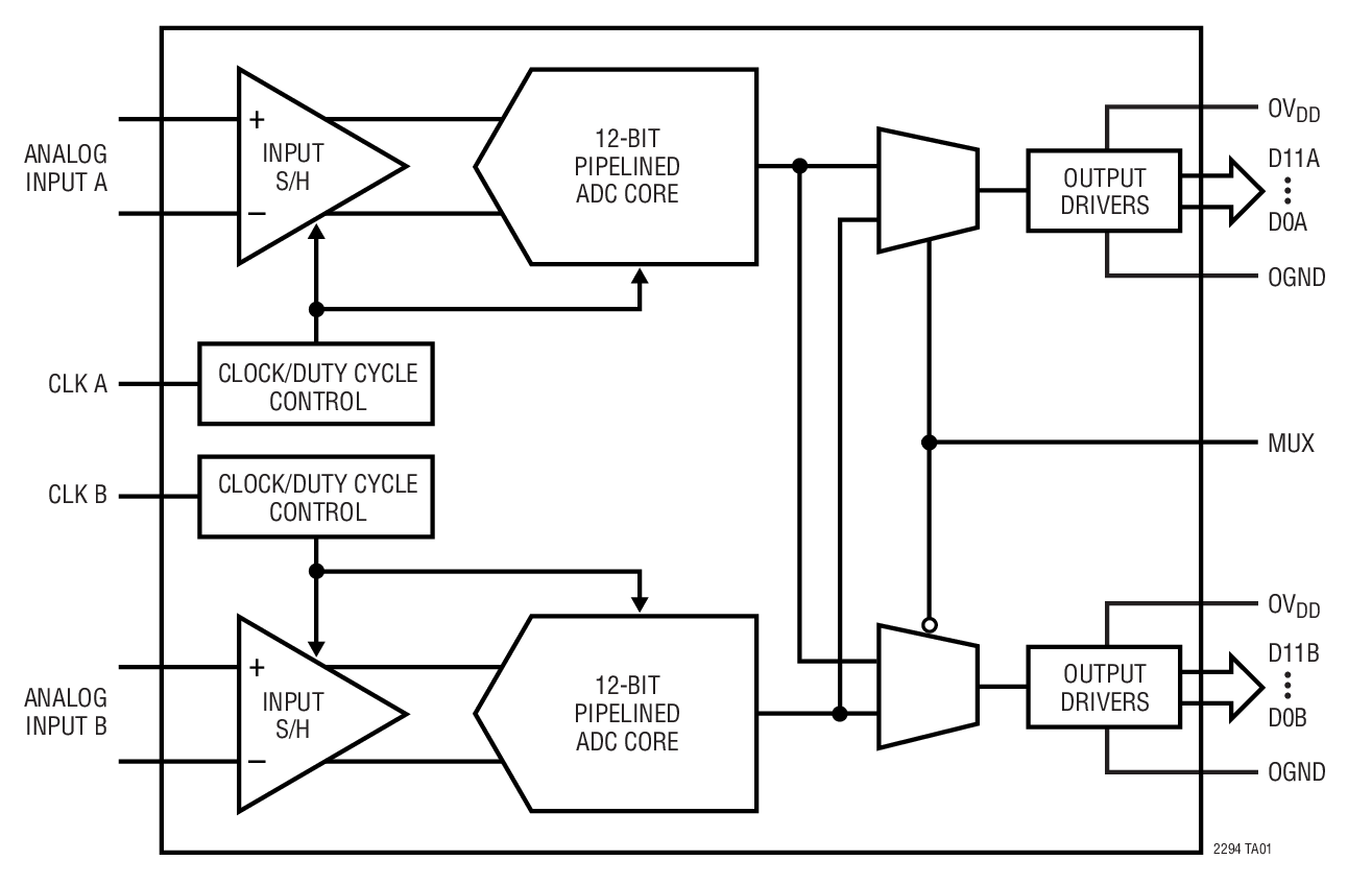 A single-ended CLK input controls converter operation. An optional clock duty cycle stabilizer allows high performance at full speed for a wide range of clock duty cycles.