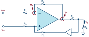 While a large R2 will reduce the speed and precision of the circuit, inserting a buffer into the feedback route to form an enhanced Howland current source will eliminate this, as shown in Figure 2. All the current flows through R0 is through into RL. The output current is calculated with Equation 2.