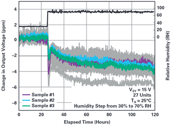 One thought to consider here before moving ahead to actual data is that the use of conformal coatings in some cases can increase mechanical stress problems. This is because the coating, if improperly applied, can add stress to the package. For instance, if, in the PCB manufacture stage, the surface of the voltage reference package has moisture on it prior to coating, this almost certainly ensures that this moisture will migrate into the hydrophilic plastic package. From the data sheet for the 1A33 product: “Cleanliness of the substrate is of extreme importance for the successful application of a conformal coating. Surfaces must be free of moisture, dirt, wax, grease, flux residues, and all other contaminants. Contamination under the coating could cause problems that may lead to assembly failures.” This is good guidance to anyone considering a conformal coating.