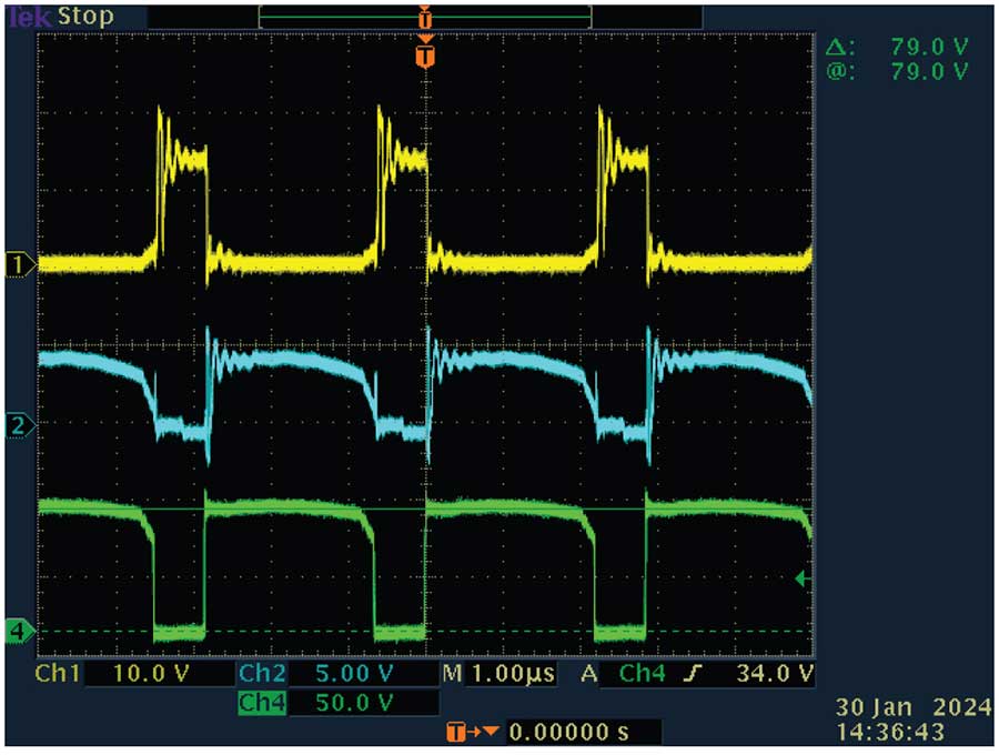 Figure 4 shows the measurement result on the example circuit. CH1 shows the voltage of Gate 1. CH2 shows the voltage of Gate 2. CH4 shows the source-drain voltage of the N-MOS at the primary side.