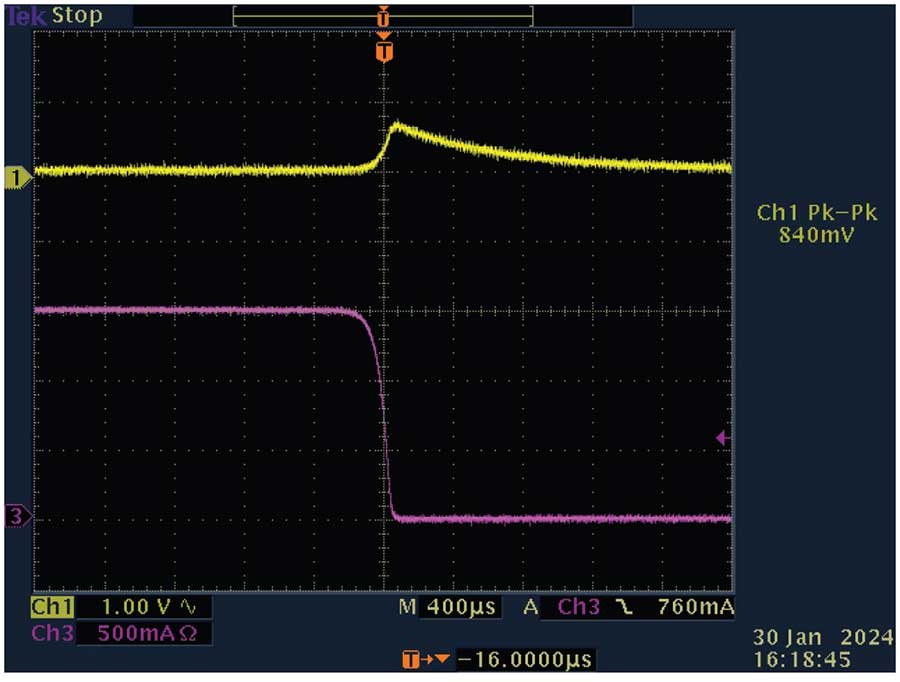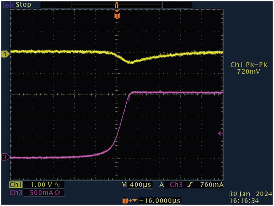 To verify the accuracy of our calculations for the gate drive circuit, we conducted performance tests on the example circuit. Figure 5 shows the input and output voltage with different load currents of 0 A, 0.5 A, 1 A, and 1.5 A.