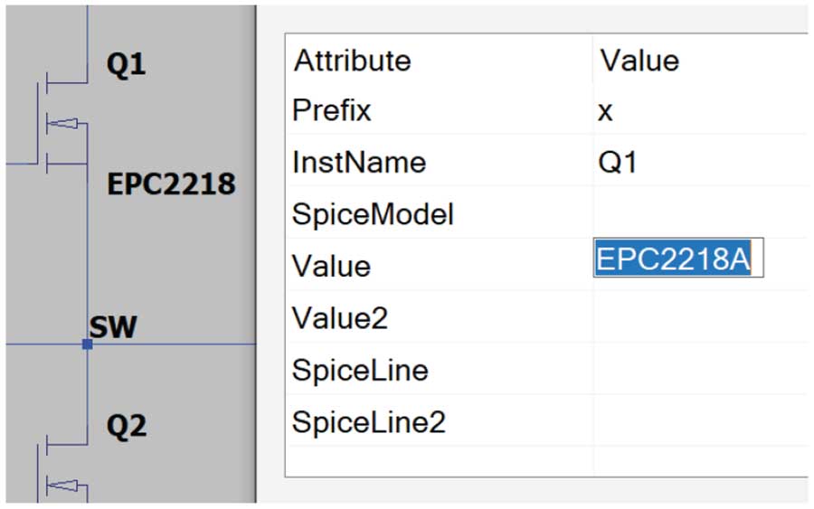 To accomplish this, press control and right-click on the NMOS symbol. A properties table appears, as shown in Figure 4, and several key attribute changes must now be made. First, the Prefix attribute needs to be changed to x. This forces LTspice to look locally for a model and the .subkt invocation with the desired name is used instead. Next, change the Value attribute to exactly match the model name directly after the .subkt in the first line of the pasted text. The InstName attribute may optionally be changed to whatever preference the user has (Q, G, etc.); the default is NM, but these are not NMOS FETs once configured to GaN devices.