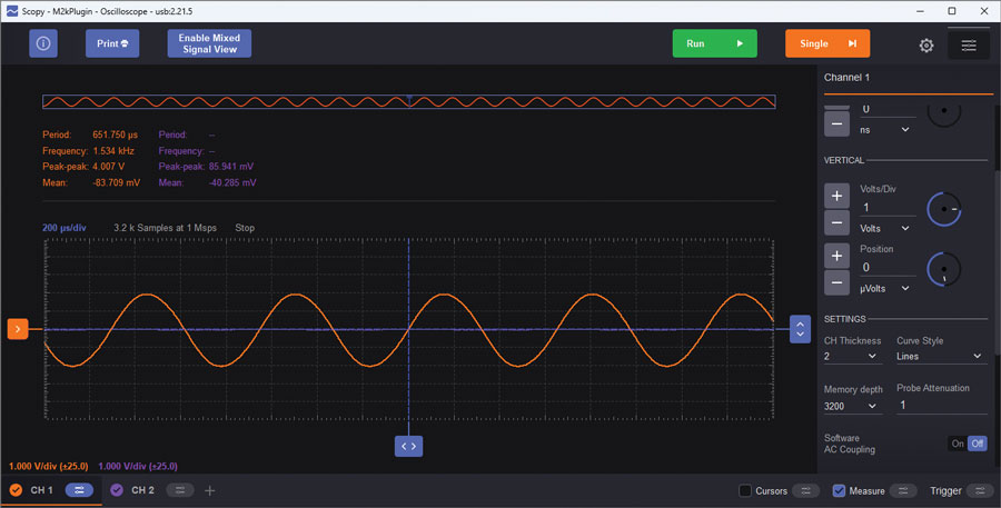 Note that R5 is a potentiometer, allowing the gain of the circuit to be dialed in to where oscillation just starts. Measure the output with Scopy’s oscilloscope; set the vertical to 1 V/div and the timebase to 200 μs/div. The results should be similar to Figure 4.