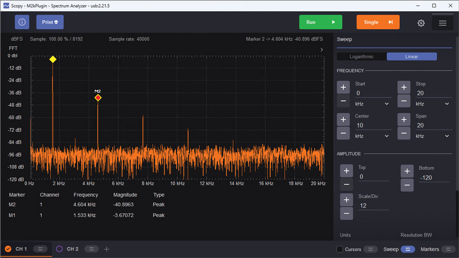 That is a nice looking sine wave, but how nice is it? Can your eye detect any distortion at all? It is nearly impossible to visually detect distortion in a time-domain (oscilloscope) plot—even with a perfect reference sine wave to compare against, distortion less than 1% is difficult to see. To truly analyze low level distortion components, Fourier transform techniques are required, and that is exactly what Scopy’s spectrum analyzer does. Open the spectrum analyzer, and set the Start frequency to 0 kHz, Stop frequency to 20 kHz, Top to 0 dB, and Bottom to –120 dB. IMPORTANT: Click the Channel 1 settings, select Blackman-Harris window, and set the Gain Mode to High.